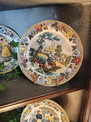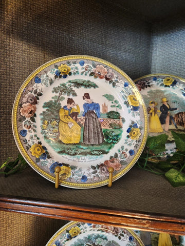 Add a charming touch of 19th-century European elegance to your collection with this beautiful matched pair of antique transferware plates, featuring richly detailed scenic and figural illustrations with beautiful borders. These plates are likely English and French in origin, dating from circa mid1800s. Mixed pictures of women and country side scenes.