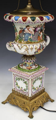 Capodimonte Style Porcelain Urn Lamp, now fashioned as a table lamp, with colorful frieze figural scene in high relief over a polychrome foliated body, having two handles, rising on a gilt metal base, approx 34"h, 9.5"diam, shade: 16"diam, 13.75lbs