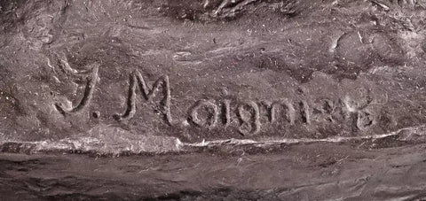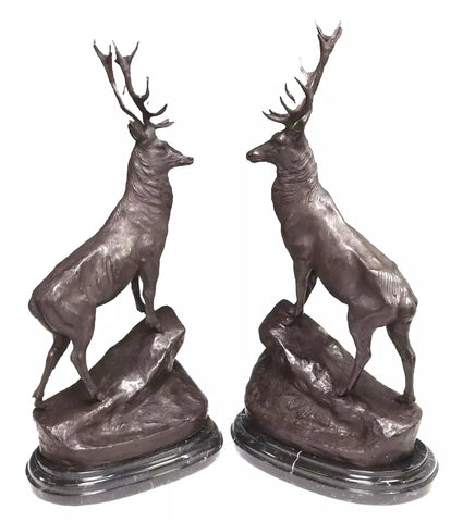 Originating from New Jersey, USA, the stags are a perfect addition to any collector's ensemble or as a statement piece for those who appreciate the serenity of animal-themed artwork. Each sculpture is signed, affirming their authenticity and artistic value. (pair) Large patinated bronze sculptures, signed in cast after Jules Moigniez (French, 1835-1894), depicting stag standing over naturalistic rocky outcrop, on stepped marble plinth, approx 29"h, 15"w, 8"d; 74 lbs total